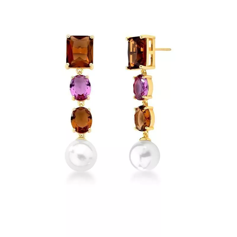 Brinco pêndulo com cristais ovais e retangulares nas cores marrom e rosa e pérola shell.